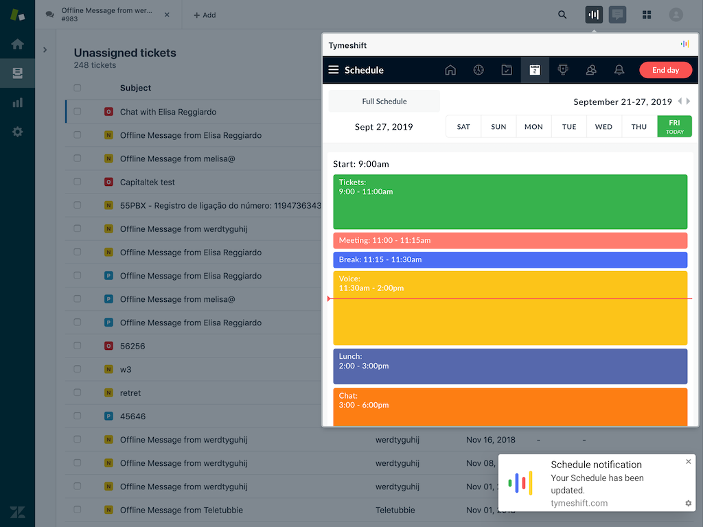 Tymeshift is an omnichannel workforce management (WFM) tool that is made exclusively for Zendesk. With a quick setup and intuitive interface, Tymeshift helps customer support teams transparently manage their workforce to make agents more efficient and managers more engaged.