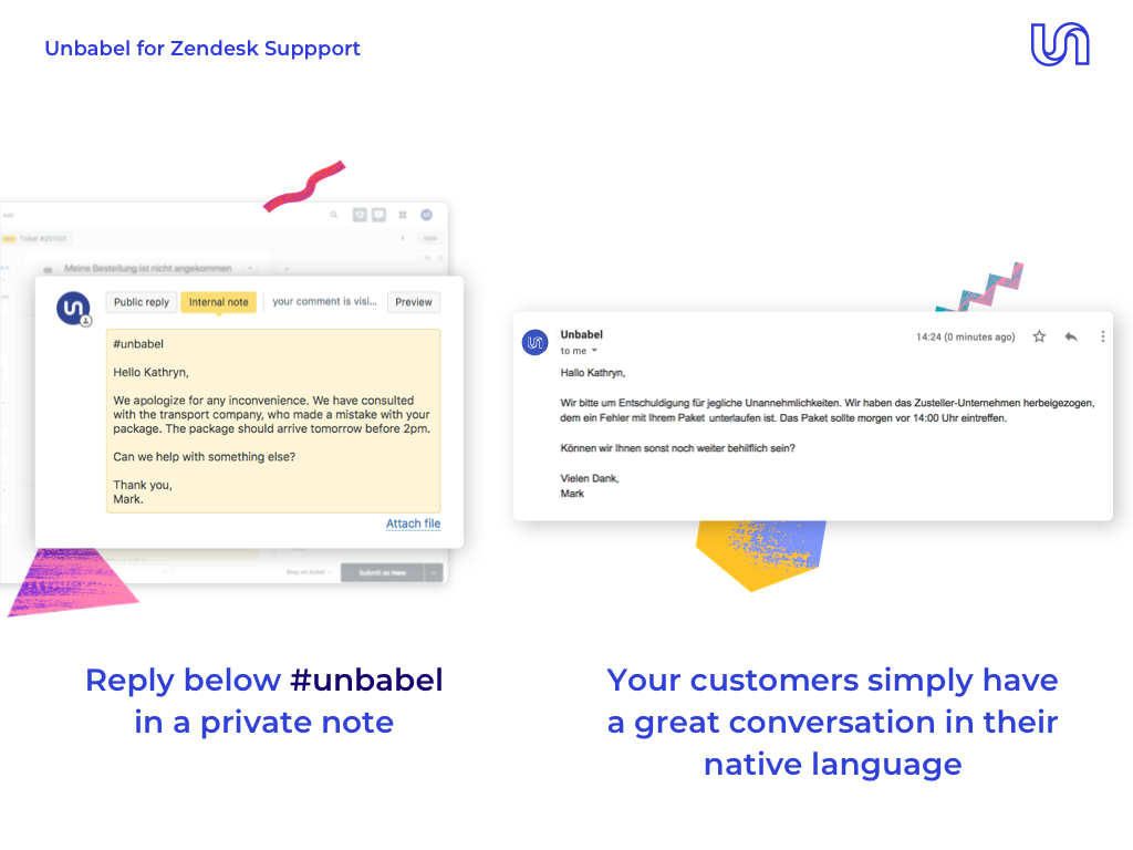 - Unbabel just goes with your Zendesk workflow, allowing you to provide comprehensive multilingual coverage without changing your current support processes.