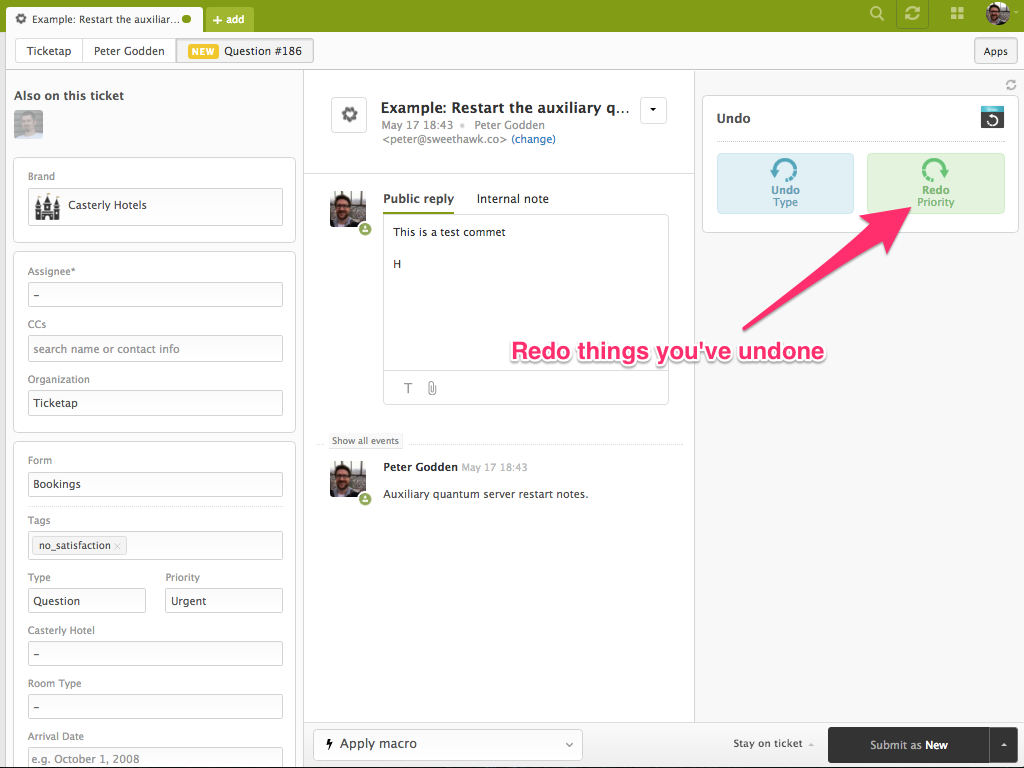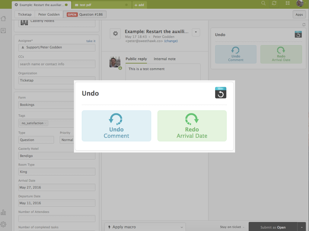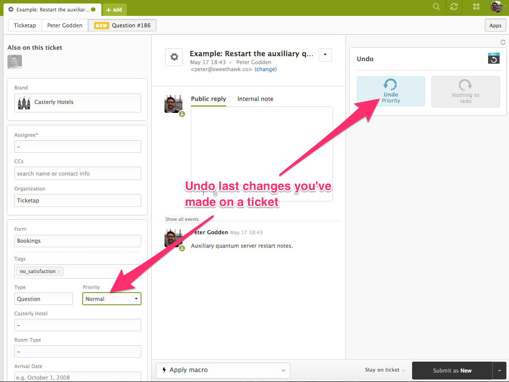 For example, if you've clicked the wrong macro which has just updated 20 ticket fields, resetting them all back isn't much fun. Now with this awesome app you can do it with a single button!