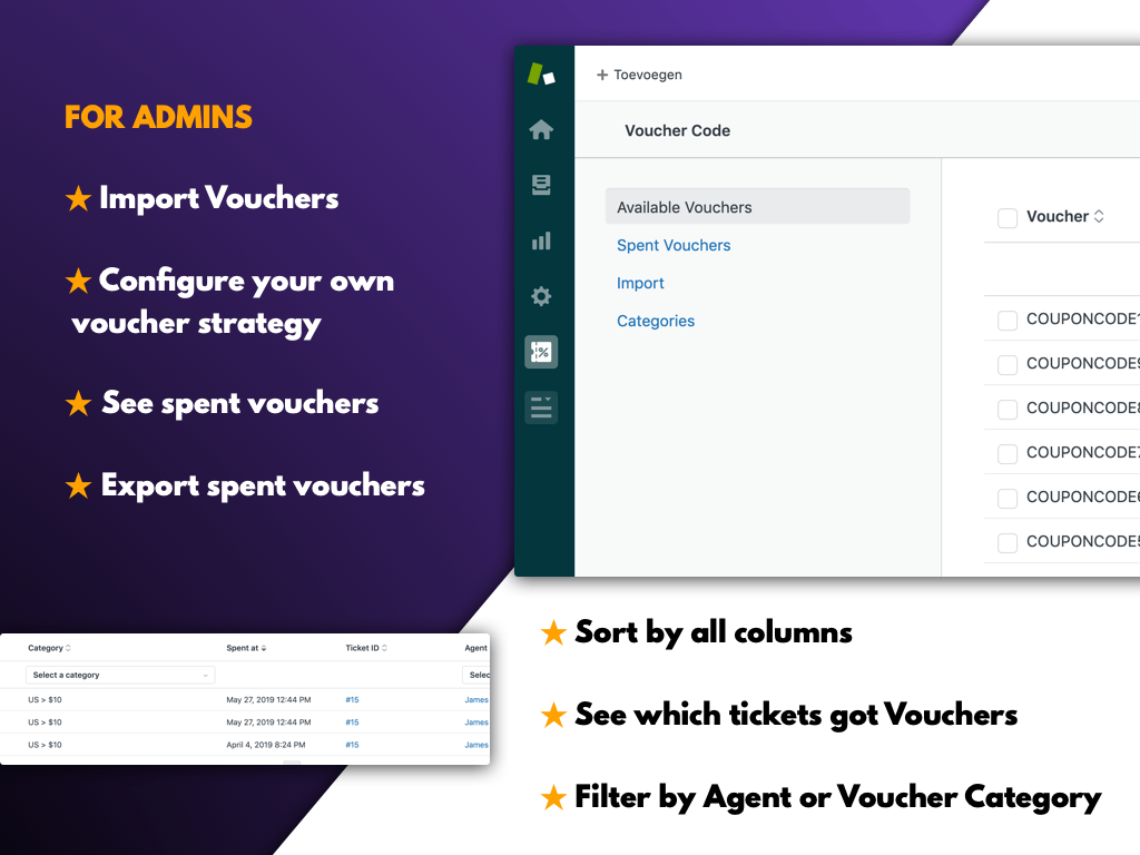 With a beautifully designed sidebar app the agent is able to select a voucher category and simply insert the voucher code in a comment.