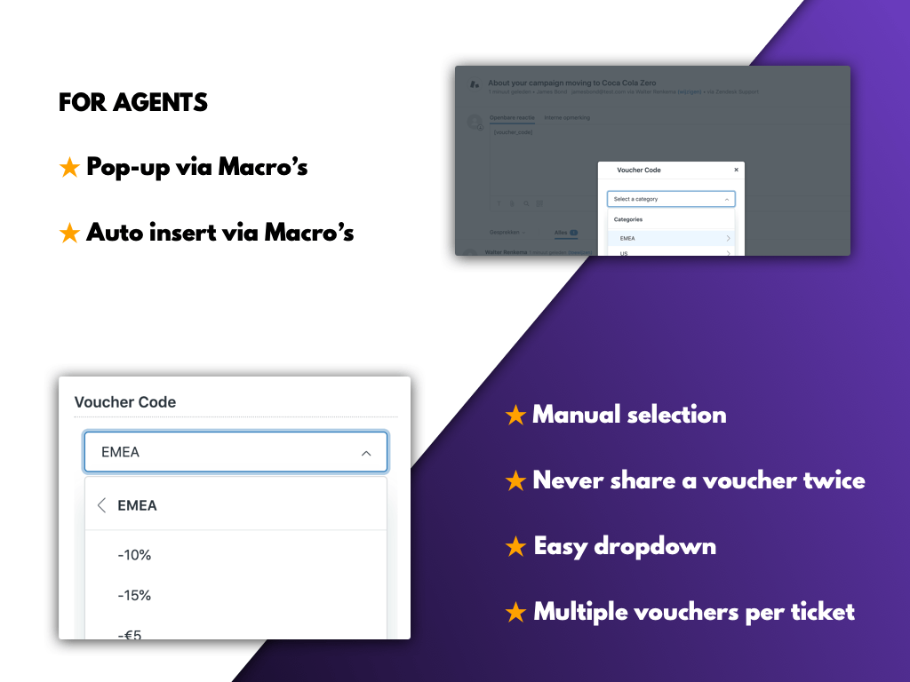 - Add [voucher_code] to macro's to toggle a pop-up for an agent whenever the macro is applied or automatically apply the correct voucher code (see our Help Center on how to do that)