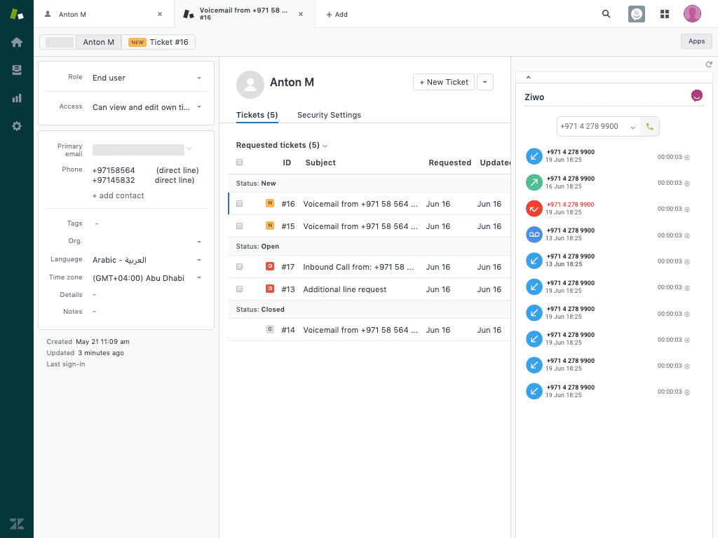 Agents don’t have to login or navigate multiple interfaces anymore. They stay in ZENDESK while ZIWO acts behind the scenes. When a call comes in, customer information pops-up automatically before the agent takes the call. Call history and voice recordings get integrated directly into a new ticket for better traceability. Are you calling back a contact? Not a problem with the click-to-call feature.