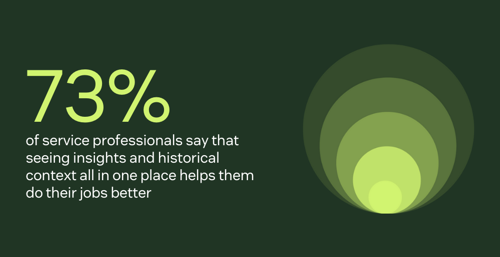 In fact, 73% of service professionals say that seeing insights and historical context all in one place helps them do their jobs better. Instead of piecing together fragmented details across multiple systems, they’re empowered with the context they need to resolve issues faster, reduce customer effort and frustration, and make every interaction smoother and more efficient.