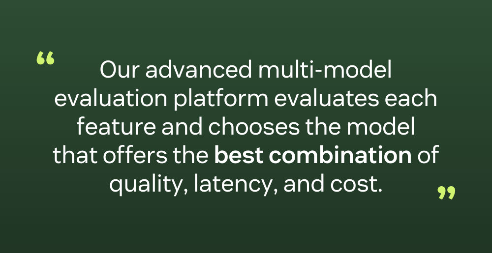 Our advanced multi-model evaluation platform evaluates each feature and chooses the model that offers the best combination of quality, latency, and cost. In practice, this means Zendesk AI selects the right model for each task, whether it is a high capacity frontier model or a model built on Zendesk’s own CX data.