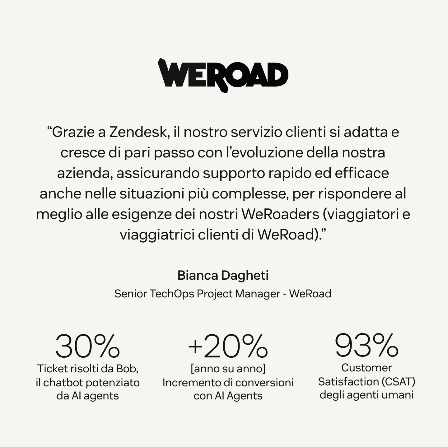 La demo ti consente di vedere Zendesk in azione con casi d'uso guidati, senza bisogno di alcuna configurazione. La prova gratuita ti dà accesso alla possibilità di provare Zendesk con i tuoi dati, team e flussi di lavoro.