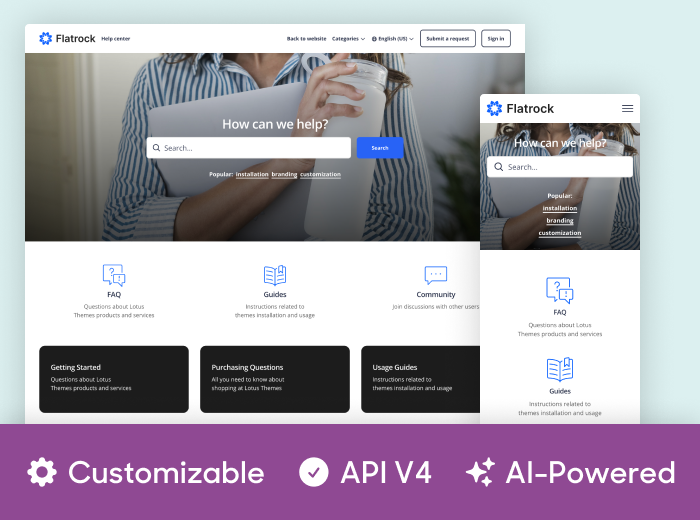 Flatrock by Lotus Themes is a modern and highly customizable Zendesk theme designed for companies that want a better Zendesk Guide experience without writing any code. Whether you’re launching a new help center or upgrading an existing one, Flatrock provides all the tools you need for a professional, branded, and user-friendly support experience.