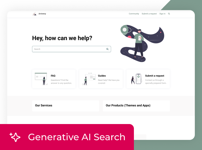 Antwerp supports Zendesk’s new generative search that delivers concise, instant answers right inside the Help Centre. When users enter a question or phrase, Zendesk scans the best-matching articles and gives them a summary answer.